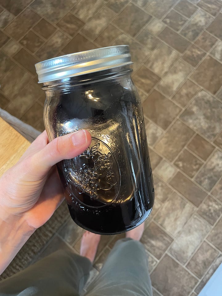 In a pot, bring the elderberries, water, cinnamon, gloves, and ginger to a boil. Reduce the heat, cover, and simmer until the liquid is reduced by half (about 45 min). Allow the liquid to cool, then drain using a mesh strainer or cheese cloth. I prefer the cheese cloth, because you can really squeeze the life out of those berries. Add raw honey and mix well. Store in a mason jar in the fridge for up to two months. (We each down a tablespoon every morning before going out into the world and swapping germs with the masses).